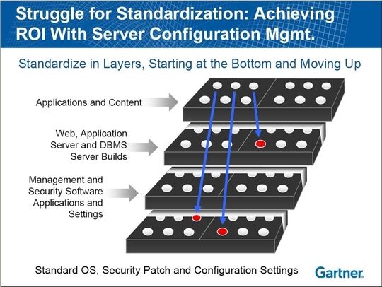 Vielerorts droht das Vorhaben Standards einzuziehen daran zu scheitern, weil das als Mammut-Aufgabe und als ein Block gesehen wird. Laut Capelli macht es Sinn, die Aufgabe schichtweise anzugehen – von unten nach oben. Bezogen auf das Server-Konfigurations-Management befände sich auf der untersten Schicht die Management- and Security-Software sowie die Applicationen und Settings. Darüber finden sich das Web-, Applications- und DBMS-Server. Bei der obersten Schicht handelt es sich um Applikationen und Inhalte.